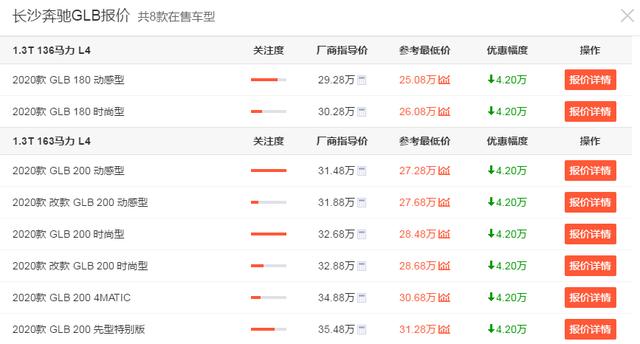 动力方面,2020款奔驰GLB全系搭载了一台1.3T涡轮增压发动机,传动方面,与之匹配的是7挡双离合变速箱,其中,1.3T低功率版最大马力为136匹。对于奔驰GLB全系搭载1.3T发动机,小编相信不用多说,大家都能感觉奔驰有点"不厚道"。如果你买的是7座奔驰GLB车型,满载出行的话,1.3T的动力会明显感觉不够用。所以,奔驰还是挺会"算账"的,价格以及优惠幅度,看上去似乎极具诱惑力,但是,全系1.3T的发动机,不就是典型的"小马拉大车"吗?