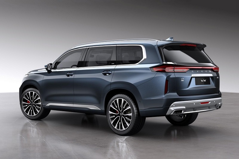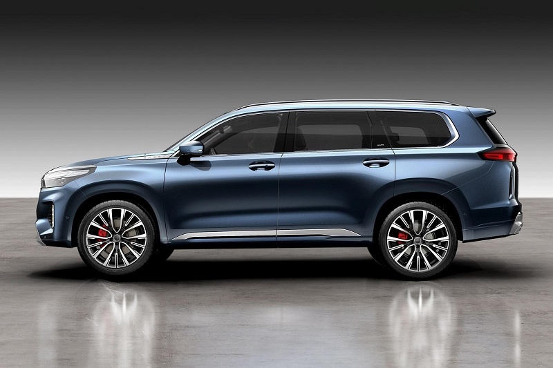 车身侧面,新车整体造型十分方正宽大,其中车侧上部用一条腰线从前部贯穿至后部,再搭配上下部一条粗壮的银色装饰,使得车侧视觉上极具层次感。此外,新车还配备了大尺寸多辐条造型轮圈,为整车增添了一丝运动感。