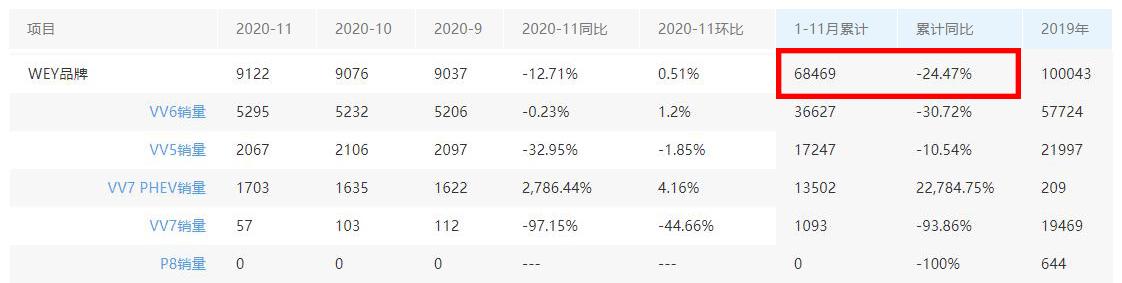 再来看WEY。作为一家以长城汽车创始人魏建军名字命名的国产高端豪华品牌,WEY至今也已经走过了好几个年头。车型方面,目前WEY品牌一共有5款车型在售,分别是VV5、VV6、VV7、VV7PHEV和P8,今年1-11月,WEY品牌也一共累计销售了68469辆新车,其中销量最好的是VV6车型,累计销量为36627辆。