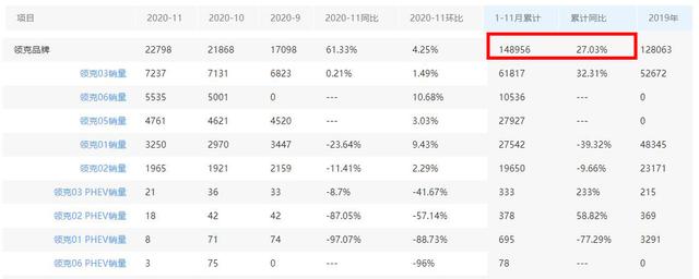 先来看领克。作为吉利品牌向上的高端化代表,领克品牌目前共拥有9款车型在售,分别是领克03 (配置|询价)、领克06、领克05、领克01、领克02、领克03PHEV、领克02PHEV、领克01PHEV以及领克O2PHEV。销量上,领克品牌在今年1-11月已经取得了148956辆新车的销量数据表现,其中领克03销量最好,1-11月累计销量61817辆。值得一提的是,领克品牌相比去年累计同比增长了27.03%,因此,疫情对于领克来说反倒是没有任何影响的。