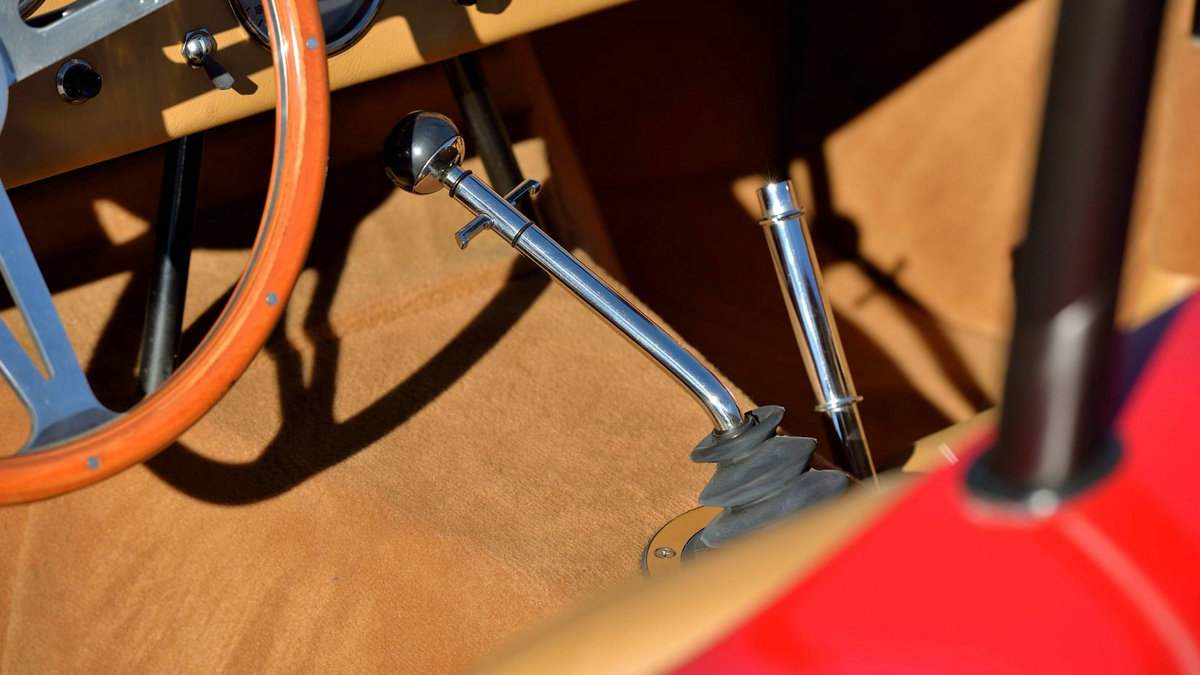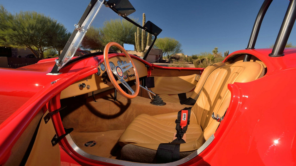 外观方面,除了之前提到的Rosso Corsa涂装和棕褐色内饰外,该车还采用了AC Cars打造的手工轧制铝制车身。此外,它还拥有不锈钢防滚杆、塞尔比定制地毯、15英寸原厂风格方向盘、S/C仪表盘布局以及Halibrand风格的15英寸针式驱动轮。