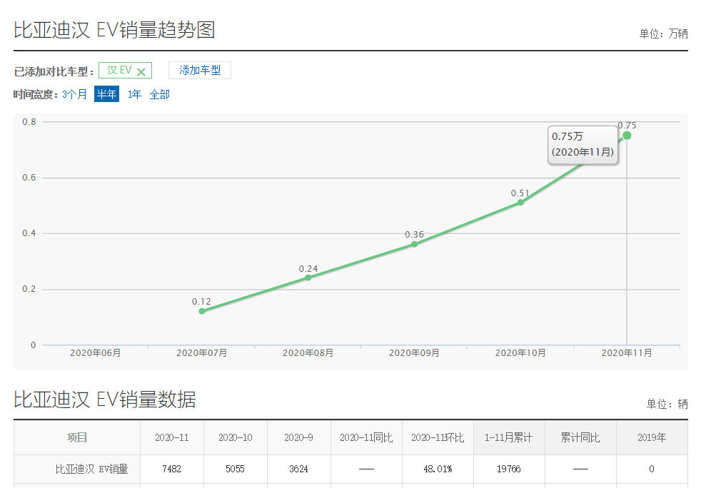 比亚迪汉EV (配置|询价)的优势在哪?首先,汉EV所搭载的刀片电池让其拥有3.9秒的百公里加速成绩和最大550km的续航表现,这是其它车型所难以企及的,也让特斯拉Model 3瞬间变得暗淡无光。其次,汉EV的车内做工和用料也都是远胜于Model 3的,因此这也就让消费者下定了决心想要拥有它。最后事实也证明,汉EV在11月取得了7482辆的销售成绩,成为为数不多、向上突破并取得小有成就的国产中大型车,值得我们为之骄傲。