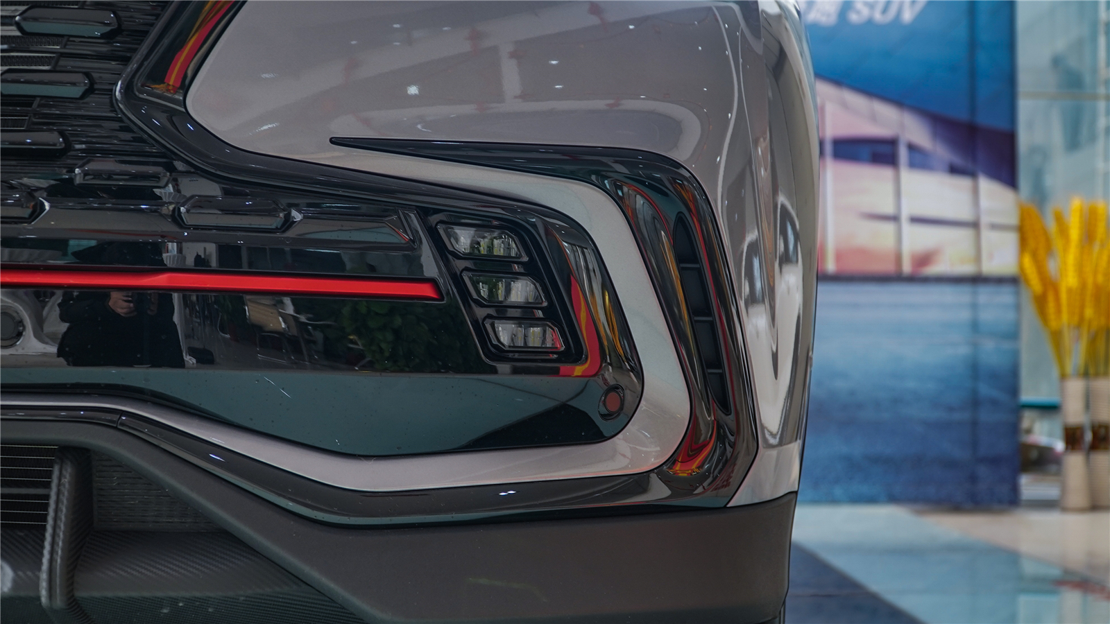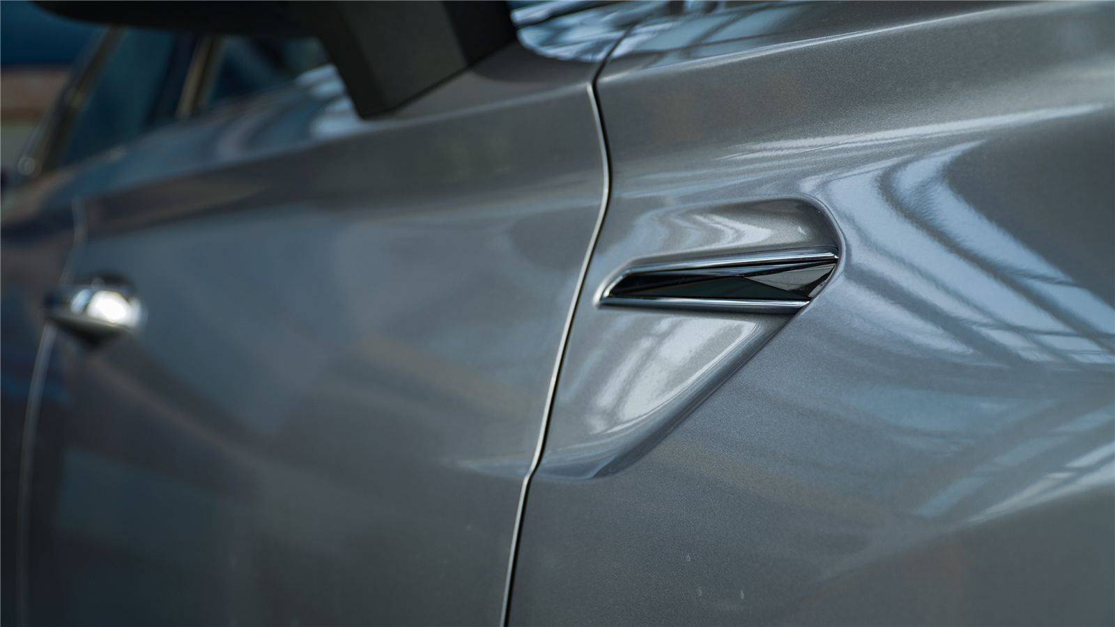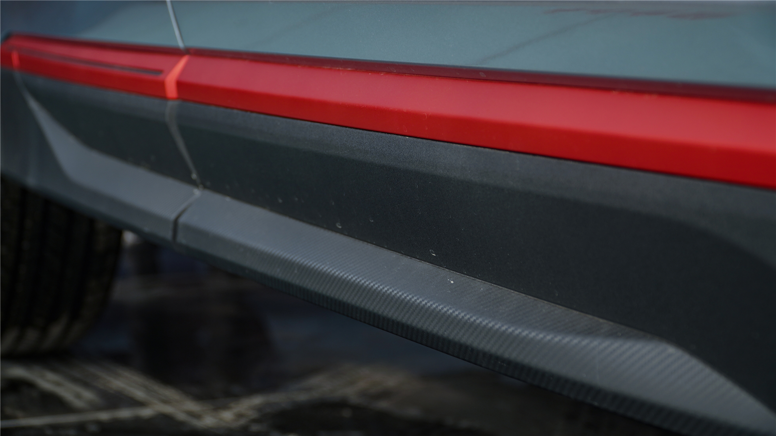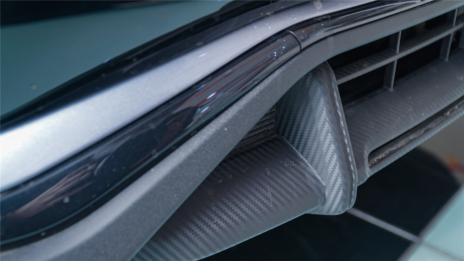 下包围采用有碳纤维质感的哑光材质,并融入一颗77GHz毫米波雷达。我们在车身诸多地方发现了安全辅助装备,构成了新车比较完备的L2级智能辅助驾驶系统。