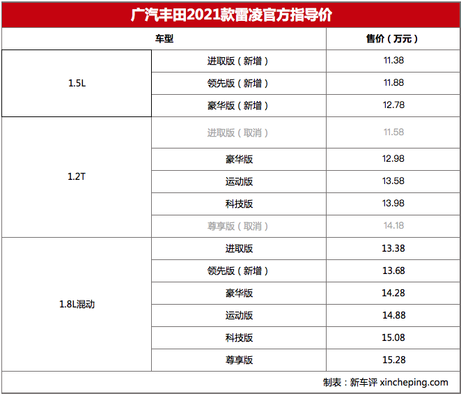 从官方公布的最新配置表中,1.2T原有进取版和尊享版两款车型已取消。在重新组合之后,雷凌家族汽油版车型和混动车型各占一半,1.8L双擎将扩大销量占比。