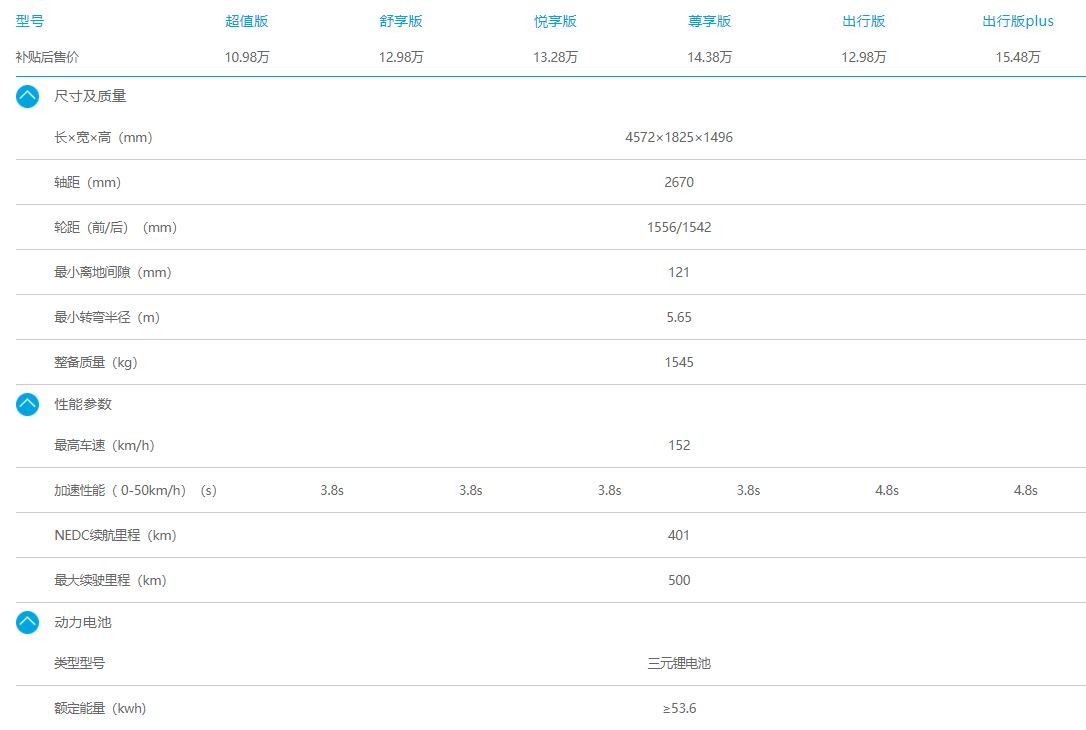 动力方面,新车将沿用现款车型的动力系统,搭载一台最大功率为120千瓦的永磁同步电机,峰值扭矩250牛·米,电池方面配备54.3千瓦时的三元锂电池组,NEDC续航里程为401km。快充模式下,仅需0.5小时即可将电量从30%充至80%,慢充模式下,电量充满需要7-9小时。