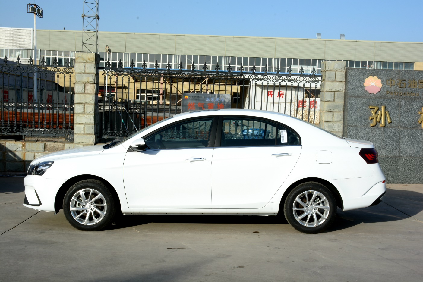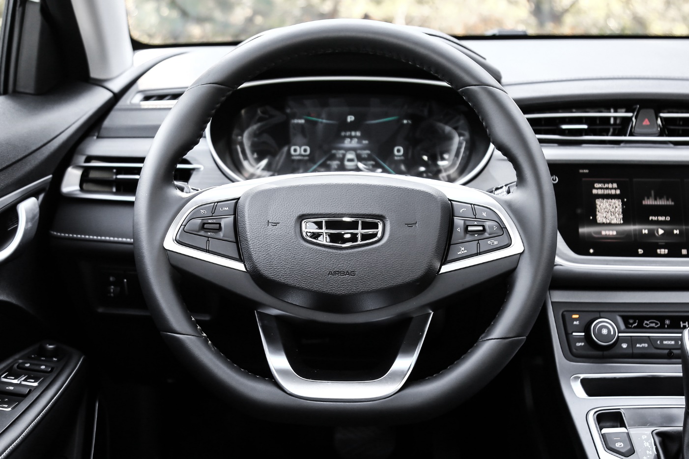 三辐式多功能方向盘同样为吉利家族样式,表面采用了环绕的镀铬装饰,中央嵌入了吉利黑色车标,只有顶配车型为皮质包裹,其余均为塑料材质,两侧按键负责行车电脑、蓝牙语音、定速巡航、多媒体调节等辅助功能。