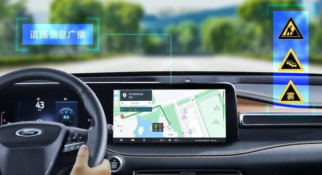 其中绿波车速是指福特车路协同系统可以结合车辆当前状态,用户驾驶意图与前方红绿灯状态,提示车主是否可以在当前绿灯通过路口。红绿灯信号功能是指当车主视线受阻时,系统会以图像和声音方式及时提醒车主前方红绿灯的状态,帮助车主做出预判,避免闯红灯风险。绿灯起步提醒是指系统会在红灯倒计时的最后几秒,通过语音及画面提醒车主;而道路信息广播能及时播报限速和危险路段、临时施工等信息,帮助车主提前调整行车路线,避免浪费时间。