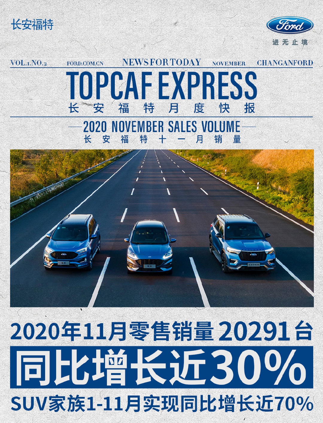 根据福特发布的最新销量数据显示,在2020年11月份,长安福特零售销量20291辆,同比增长近30%。连续两个月零售销量突破2万台,跑赢中国乘用车市场整体增速。