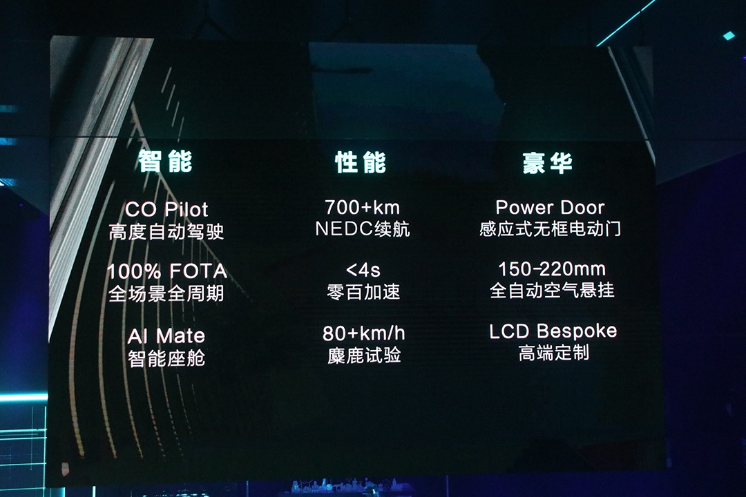 新车基于SEA浩瀚架构打造而来,采用钢铝车身,在白车身上采用了轻量化设计。关于新车现有消息,车身长度为4950mm,轴距为2999mm;配备有高度可调的空气悬挂,具备高度自动驾驶能力,拥有全场景、全周期FOTA,以及智能座舱。在动力性能及续航部分,新车NEDC续航超700km,0-100km/h加速时间小于4秒,麋鹿测试成绩大于80km/h。