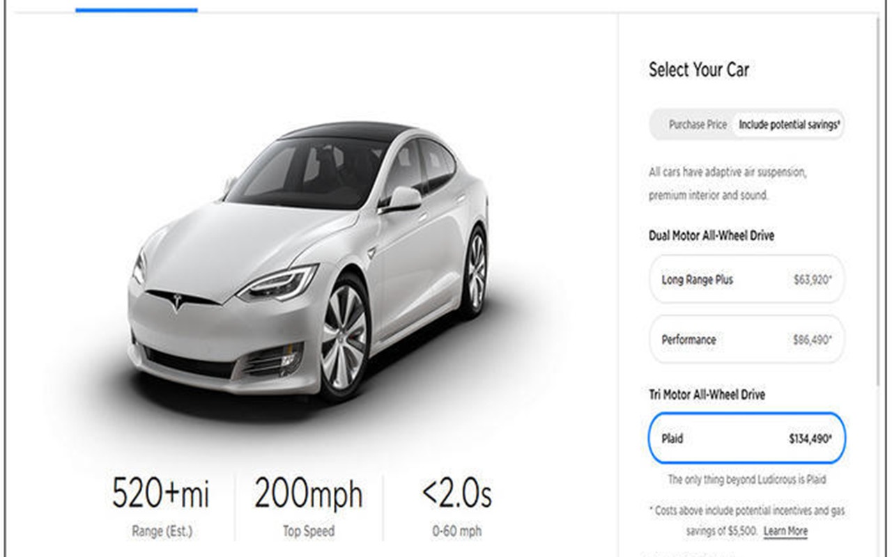 特斯拉Model S Plaid原型车,搭载三台电动机,根据特斯拉的说法,特斯拉Model S Plaid将实现520英里(836公里)以上的续航里程,最高速度可达200mph(321km/h),零至百公里加速时间仅需2.1秒。