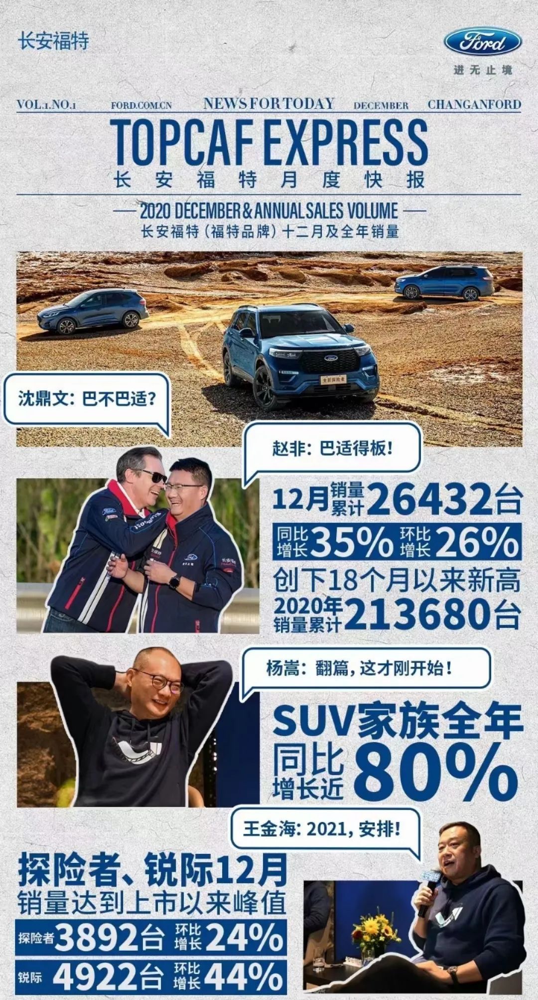 昨日,长安福特公布最新销量数据。12月,长安福特累计销量达26432台,创下过去18个月以来单月销量新高,实现同比环比双增长,同比增长35%、环比增长26%;2020年,长安福特全年累计销量达213680台,同比增长超30%,尤其是福特的SUV家族,一举拿下了近80%的同比增长。