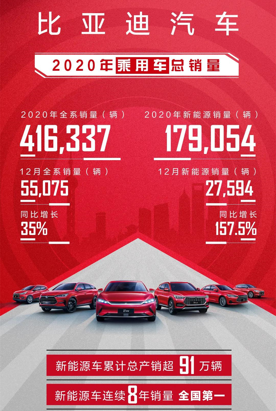 乘用车方面,比亚迪乘用车2020年的销量为416337辆,其中新能源乘用车为179054辆。2020年12月,比亚迪乘用车销量为55075辆,同比增长35%;12月新能源乘用车销量为27594辆,同比大涨157.5%。