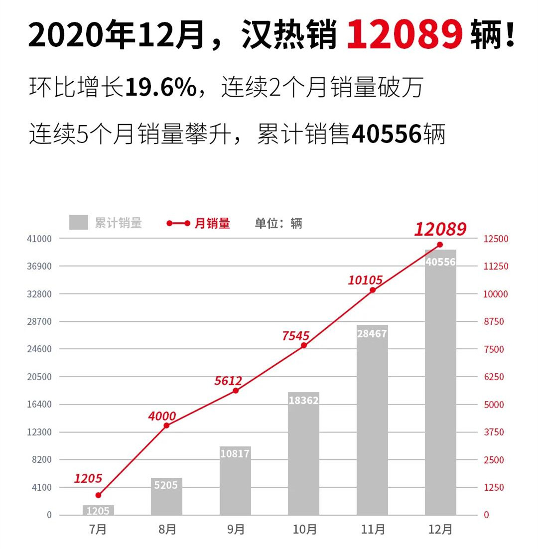 具体车型方面,比亚迪汉12月销量达12089辆,环比涨19.6%,实现连续两个月销量破万。很显然,比亚迪新能源乘用车能在12月实现如此大幅度的增长,与比亚迪汉的出色表现有很大关系。2020年7-12月,比亚迪汉累计销量已达40556辆。