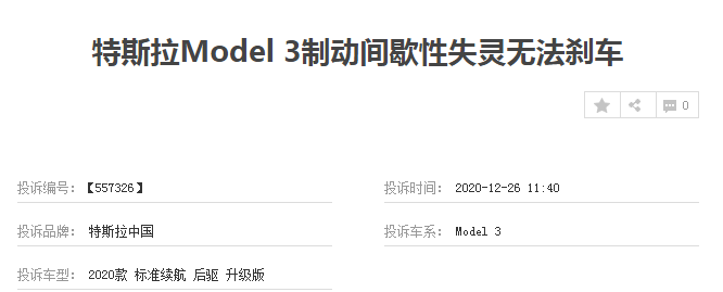 这一位特斯拉Model 3车主更是表示,自己购车后不久就出现了间歇性失灵无法刹车的情况,对于一台才买1个多月的新车,就有如此之问题,也不知道国产后的特斯拉Model 3是如何把控的品质,并且,还都不是小问题,好在没有出现人员事故。在这里小编想说,对于新能源汽车,我们不少朋友觉得,续航问题是新能源汽车的最大弊端,而燃油车就不存在这一问题,没有了随处可见的加油站,开进去加个油又能继续行驶,抛开续航充电问题不说,新能源汽车出现故障也相对更为麻烦,维修费用也较为高昂,所以,我们在选择的时候,一定要多综合自身购车需求考虑。
