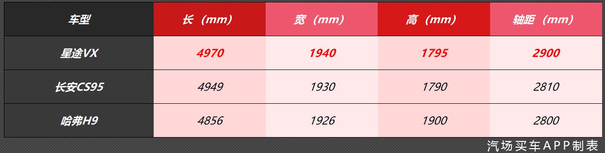 车身尺寸方面,星途揽月的长宽高为4970mm、1940mm、1795mm,轴距为2900mm。其车身尺寸比长安CS95、哈弗H9更长、更宽、更高,尤其2900mm的轴距,绝对是目前国内中大型SUV的佼佼者。