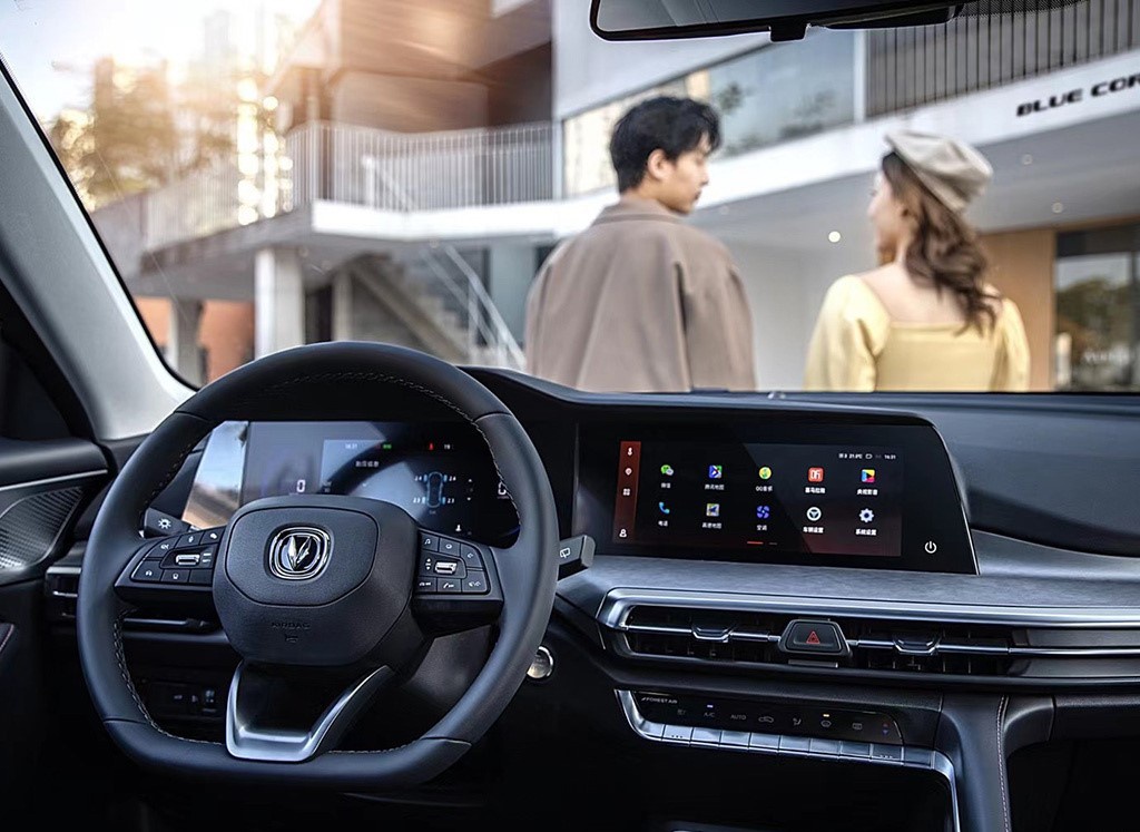 新款CS35 PLUS的内饰设计极富层次感,并且双联屏的设计为内饰增加了科技感,在全液晶仪表上方还设计有遮阳板,非常实用。屏幕下方设计有银色饰板,空调出风口富有质感,下方还设计有简约的空调控制面板,视觉感受非常时尚。
