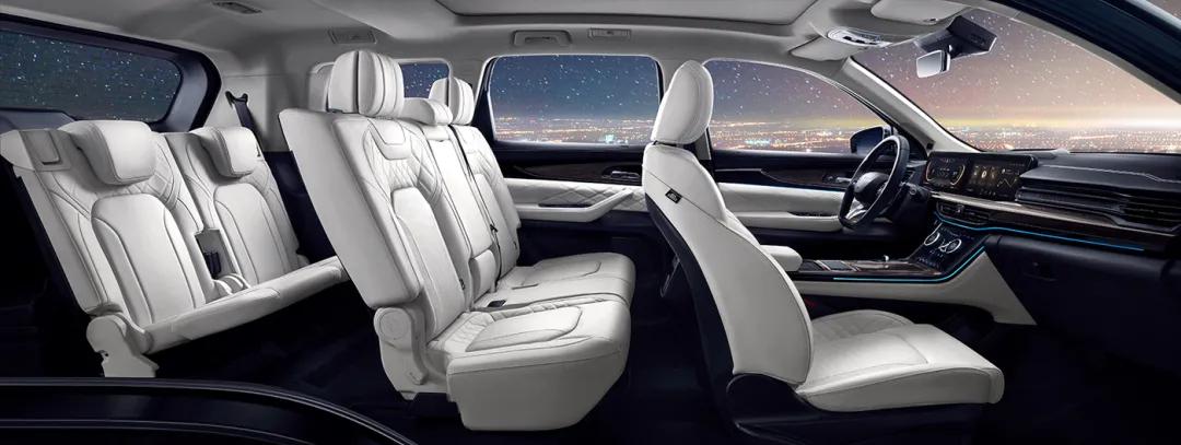 揽月是星途品牌全新的旗舰,定位中大型SUV,长度超4.9米,轴距2.9米,7座布局,座椅为2+3+2。它的造型比较方正,格栅尺寸很大,搭配横向镀铬饰条,显得比较端庄。侧面和尾部的造型同样比较简单,个人认为星途的思路是正确的。这种大车,如果采用复杂线条是很考验设计功力的,搞不好就弄巧成拙,作为刚成立不久的品牌,还是稳点好。