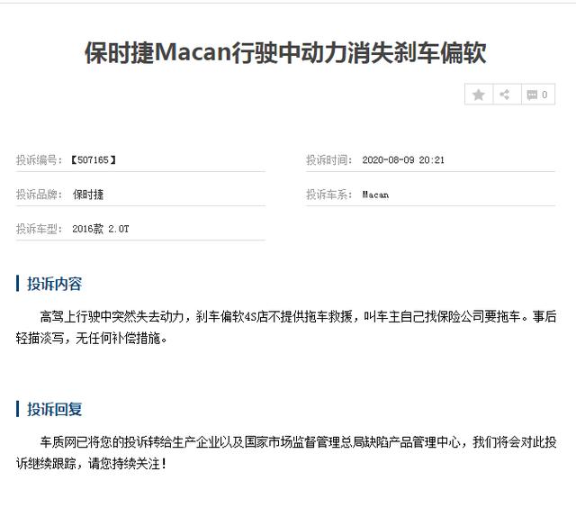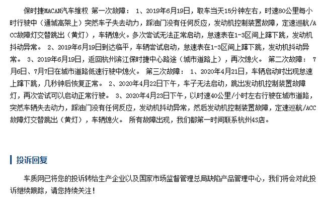同样的问题,还有这两位保时捷Macan车主,第一位车主表示,高速上行驶突然失去动力,并且4S店事后也是轻描淡写,没有任何的补偿,小编认为,起码也要告知车主为什么会出现这样的问题吧,并且,之后还会不会出现此类问题以及解决方案给到车主,这才是售后的基本态度吧,而不是轻描淡写。第二位车主更是表示,自己购车不久就出现了发动机熄火的问题,之后就是断断续续的存在,对于发动机突然熄火,这就不是普通的小毛病了,对于车主而言,存在着极大的安全隐患。对于此类毛病,小编想说,看来即便是豪华汽车,依旧也会有着不小的"毛病",所以,汽车并不是越贵就一定越好。
