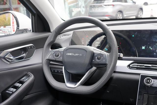 三幅式方向盘采用皮质包裹,握持手感不错,并且方向盘中间印有"BEIJING"几个字母,看起来给人也比较精致,并支持4向手动调节。
