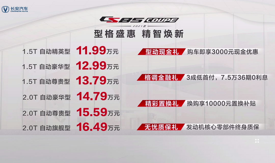 2021年1月8日,2021款长安CS85 COUPE通过直播活动正式上市,新车共推出6款车型,售价为11.99万-16.49万元。新车作为年度改款车型,相比老款车型变化不大,主要针对外观细节部分作出了调整,整体造型更加年轻、运动。