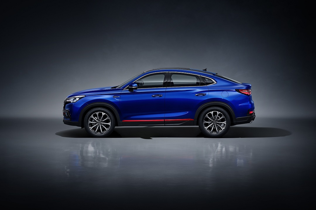 车身侧面,新车依然是典型的溜背轿跑式SUV车身造型,车顶曲线从A柱开始就逐渐下坠,最后延伸至车尾,形成一条流畅的曲线,视觉上十分动感。并且,新车还采用双层腰线勾勒车身,再加上前后翼子板上的立体线条,以及车侧下部的红色饰条,使得整车的力量感和层次感十分突出。此外,新车还配备了多辐条造型银黑双色涂装的轮圈,使得整车的运动气息更加浓厚。