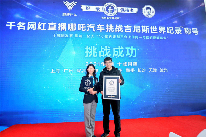 在直播中宣导“科技温暖中国”,千名网红喊出“哪吒汽车让安全更智能”口号。活动现场,千名网红主播在一个小时内上传了一千条视频时,还原了吉尼斯世界纪录挑战的全程。吉尼斯世界纪录认证官宣布由哪吒汽车发起的“1小时内定制平台上传同一句话的视频最多”吉尼斯世界纪录称号挑战成功!