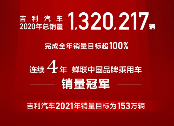吉利汽车公布其2020年1-12月的累计销量为1,320,217辆,连续4年蝉联中国品牌乘用车销量冠军。同时,吉利汽车将2021年销量目标定为153万辆,同比增长16%。