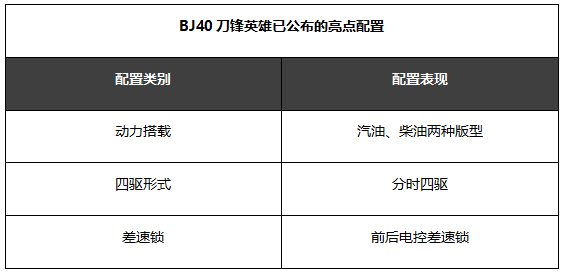 再如,为了达到长续航大扭矩的动力,刀锋英雄甚至还推出了柴油版本,搭载2.0D+8AT的动力总成,续航里程和驾驶平顺性或将成为该车最大的亮点;而应付沙漠里对胎压的实时掌握,刀锋英雄甚至连备胎都配备了TPMS,当然分时四驱配合前后电控锁实现的“三把锁”的优势在刀锋英雄身上必然也是标配……很显然,BJ40刀锋英雄,无论从命名还是产品表现来看,它就是一款以专业赛事理念标准打造的专业越野车,其身上到底还有多少达喀尔赛场的技术元素,相信也会在赛事凯旋之日公布于众!