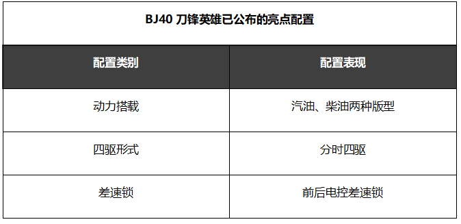 为了达到长续航大扭矩的动力,刀锋英雄甚至还推出了柴油版本,搭载2.0D+8AT的动力总成,续航里程和驾驶平顺性或将成为该车最大的亮点;而应付沙漠里对胎压的实时掌握,刀锋英雄甚至连备胎都配备了TPMS,当然分时四驱配合前后电控锁实现的“三把锁”的优势在刀锋英雄身上必然也是标配。很显然,BJ40刀锋英雄,无论从命名还是产品表现来看,它就是一款以专业赛事理念标准打造的专业越野车。
