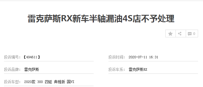 人无完人,汽车同样如此,在投诉方面,雷克萨斯RX遭到了不少车主的投诉,不管是之前的老款车型,还是目前在售的2020款雷克萨斯RX,都有车主反映其问题。对于这些不足之处也希望雷克萨斯要予以重视,毕竟,在国内深受我们不少消费者的认可,品质的优异,才能赢得更多的青睐,难道不是吗?