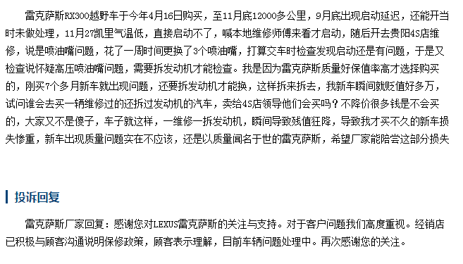 这一位雷克萨斯RX的车主表示,自己购车后不久,才行驶了12000多公里,9月份的时候就出现了启动延迟,到后来就直接启动不了,最后到4S进行维修,修理交车检查的时候,车主发现启动还是存在问题,4S店又表现怀疑高压喷油嘴问题,需要拆发动机检查。可能不少朋友不以为然,觉得这不就是一点小事吗,那么小编想问,如果是你,你买一台新车,没开多久就出现这样的问题,你自己会觉得是小事吗?一向以品质著称的雷克萨斯,实在不应该是这般质量。