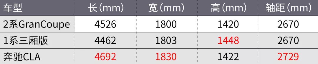从车身尺寸上来看,2系GranCoupe与国产三厢1系差别不大,轴距保持一致。但是对比同样采用轿跑设计的奔驰CLA,宝马2系GranCoupe则可以说是小了一整圈,这也是为什么2系的侧面看起来不如CLA低矮修长的原因。