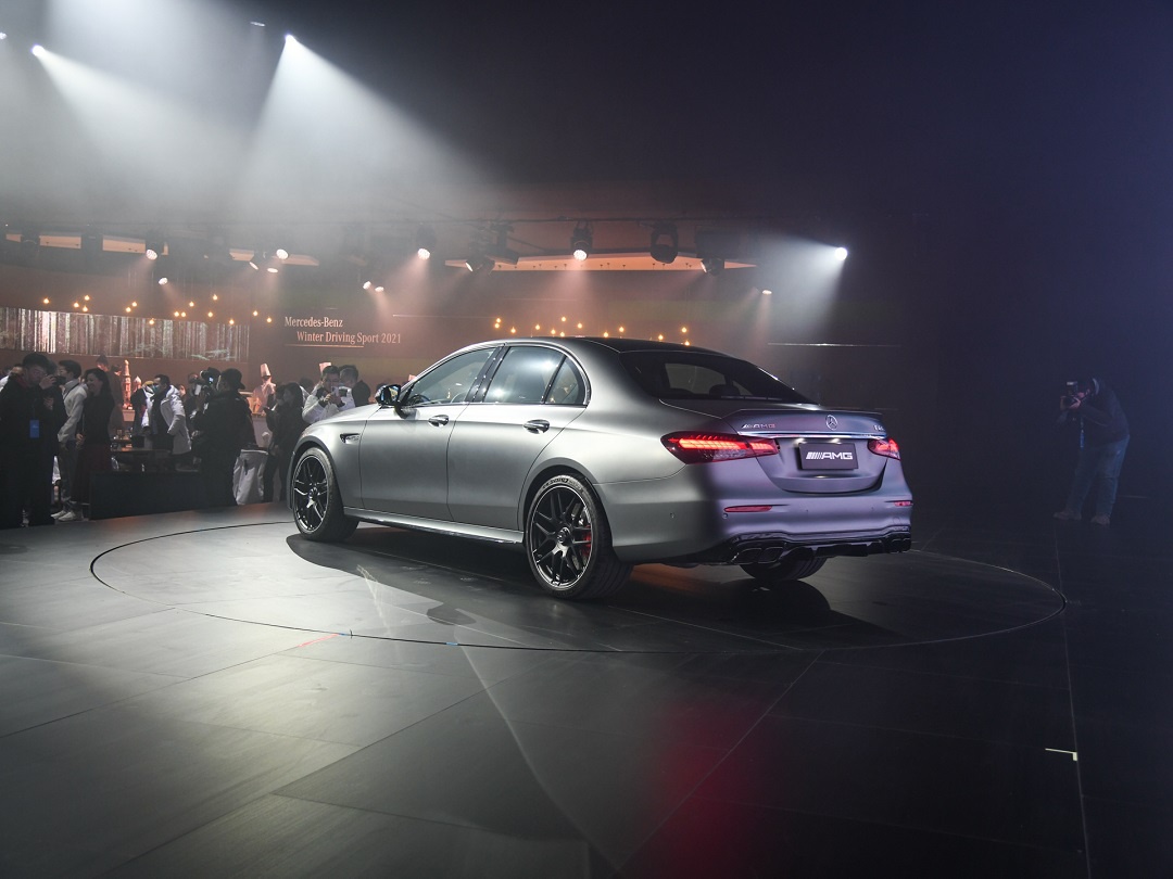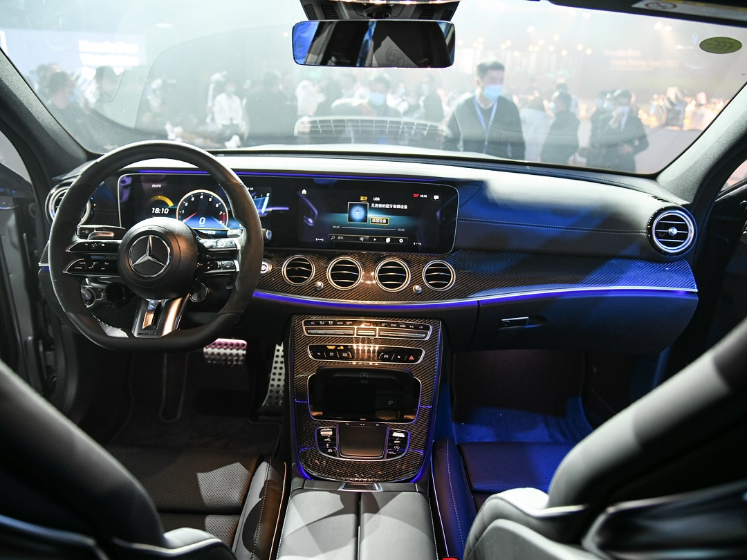 车尾部分,新车改动也比较大,相比现款车型,新款AMG E级车尾造型更加灵动优雅,尾灯采用一根镀铬饰条贯穿车尾,带来了不错的视觉效果。同时,碳纤维扰流板、方形排气口以及后包围也彰显了新车的运动属性。