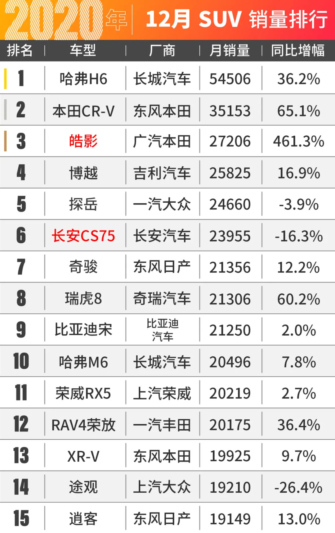 相比起轿车市场的你争我夺来说,SUV市场榜单乍一看似乎平平无奇,可实际上却是暗潮涌动。不用我说,你们应该也能猜到,哈弗H6再一次获得了销量榜的第一名。可排在第二名的车型却不再是长安的CS75,反倒是来自东风本田的CR-V!但这还不算最离谱的,因为CR-V的姊妹车型--皓影 (配置|询价),竟然以单月2.7万台的成绩直接来到了榜单的第三名。