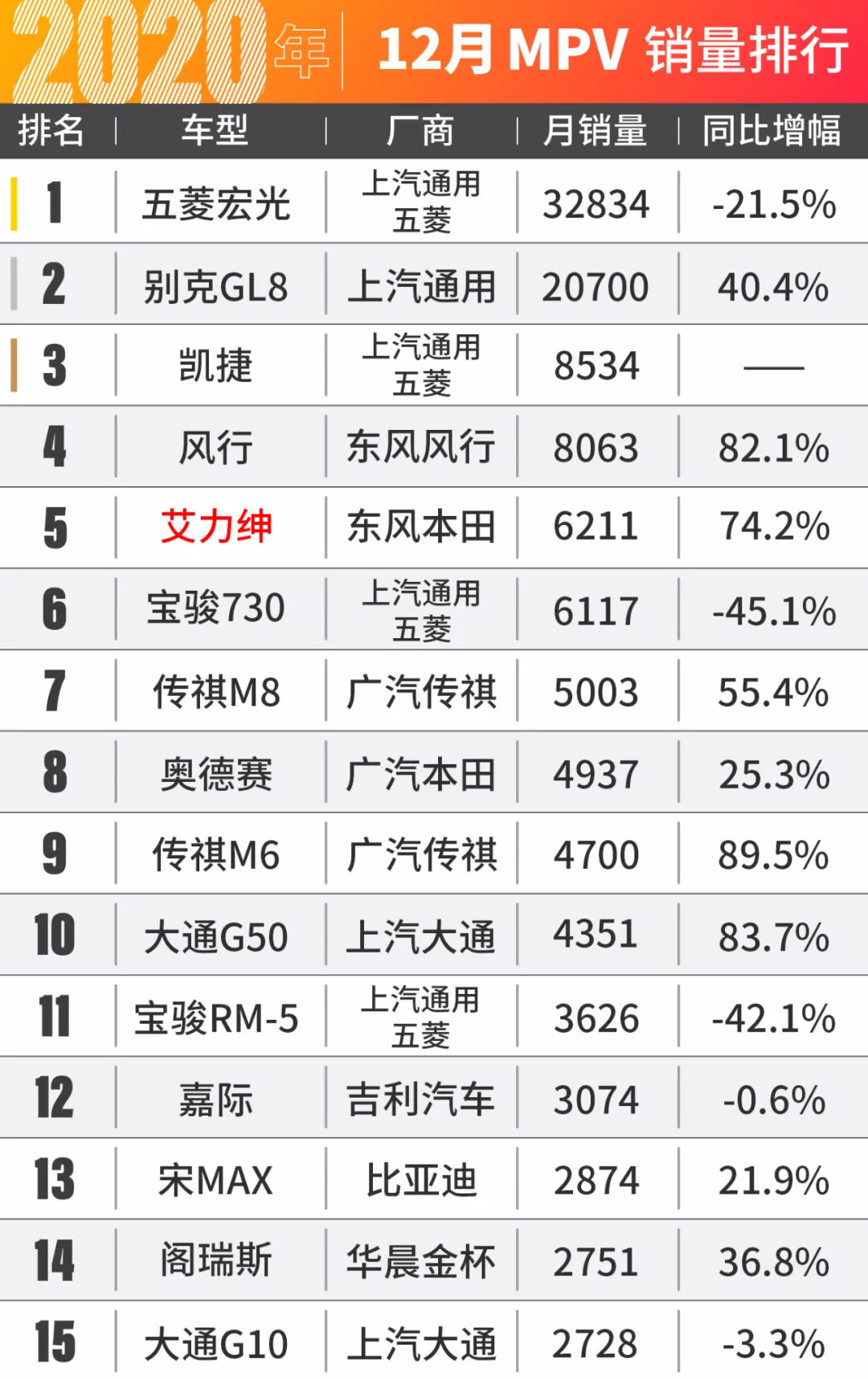 一向平静的MPV市场依旧波澜不惊,五菱宏光、别克GL8和新晋第三名--五菱凯捷,再次霸占了MPV榜单的前三名!看来短时间内,这三位的名次应该不会发生变动了。