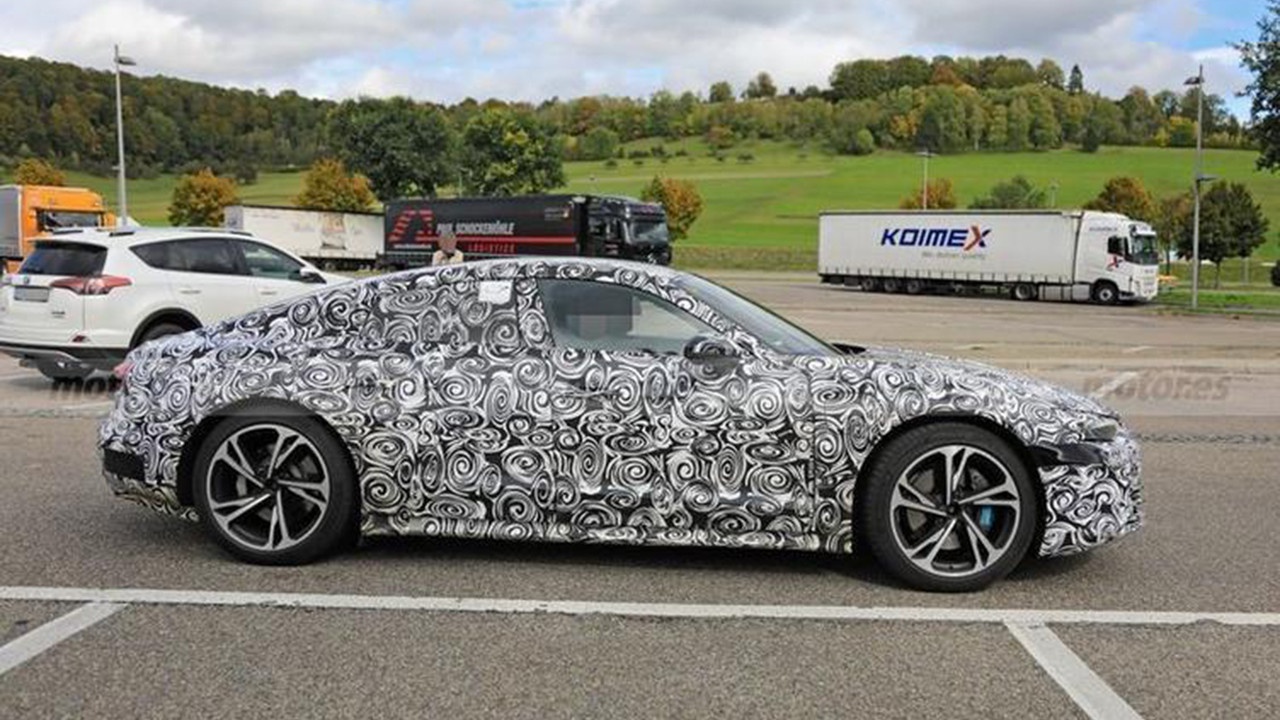 外观部分,从谍照中我们可以看出,新车与此前曝光的预告图基本一致,前脸部分新车采用了封闭式的前格栅设计,并且将与两侧的前大灯相连。车身侧面新车采用了溜背式的造型设计,并且配备的蓝色的刹车卡钳,为整车营造了很好的运动效果,车辆尾部新车看起来与保时捷Panamera (配置|询价)十分相似,预计也将采用贯穿式尾灯。
