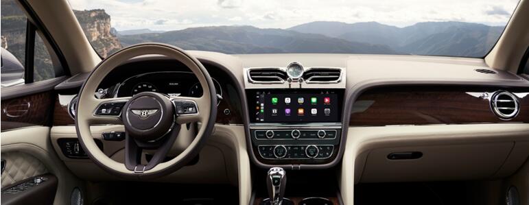 论设计,添越PHEV车内的整体造型是偏向典雅且古朴的。这不是在形容它的内饰有如上了年纪的车型一样显得老气横秋,更多的是一种对经典的传承,也是一种致敬。大量精致的实木被巧妙的安置在中控上,细腻的接缝让人根本挑不出瑕疵。而在科技配置上,添越PHEV也没有任何落伍的意思。首先便是分辨率极高且功能完善的10.9英寸触摸屏,还有液晶仪表上可显示导航信息的增强版HUD,都让人感受到,宾利在现代科技与古典设计上的完美融合。