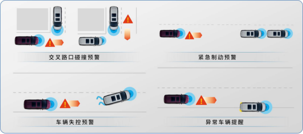 车辆失控预警CLW(Control Loss Warning):当前车的制动防抱死系统、车身稳定系统、牵引力控制系统等任意功能触发时,前车对外广播状态信息,若自身车辆根据收到的消息识别出该车属于车辆失控,且可能影响自身行驶路线时,系统将对驾驶者进行提醒。