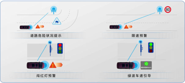 绿波车速引导GLOSA(Green Light Optimal Speed Advisory):当车辆驶向信号灯控制的交叉路口时,能够根据路侧单元发送的道路数据及信号灯实时数据,系统给予驾驶者建议车速区间,以便车辆能够经济、舒适地通过路口,无需停车等待。