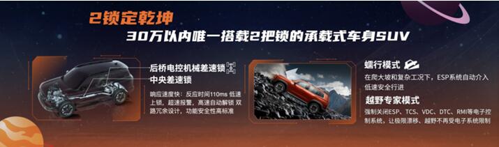 除此之外,哈弗大狗2.0T四驱版是30万元以内唯一搭载两把锁的承载式车身SUV,这使其拥有了“高性能越野车的灵魂”。其中一把锁来自Haldex四驱系统的中央电控差速锁,而另一把后桥电控机械牙嵌式差速锁,在单一侧车轮打滑的情况下,可帮助车辆实现车轮间100%的扭矩传递,让复杂路况下的脱困变得轻而易举,也令雪地、泥地、沙地的行驶更加稳健顺畅。