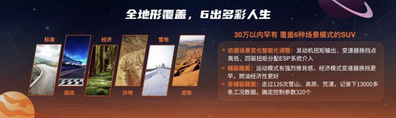“6”种地形驾驶模式(标准模式/运动模式/泥地模式/沙地模式/雪地模式/经济模式)更进一步提高了越野适应能力。哈弗大狗的工程师们走过126次雪山、高原、荒漠,记录下13000多条工况数据,确定控制参数320个,最终让它变得更加完美和强悍,让哈弗大狗的用户可以纵情驰骋,享受征服全地形的激情和乐趣。