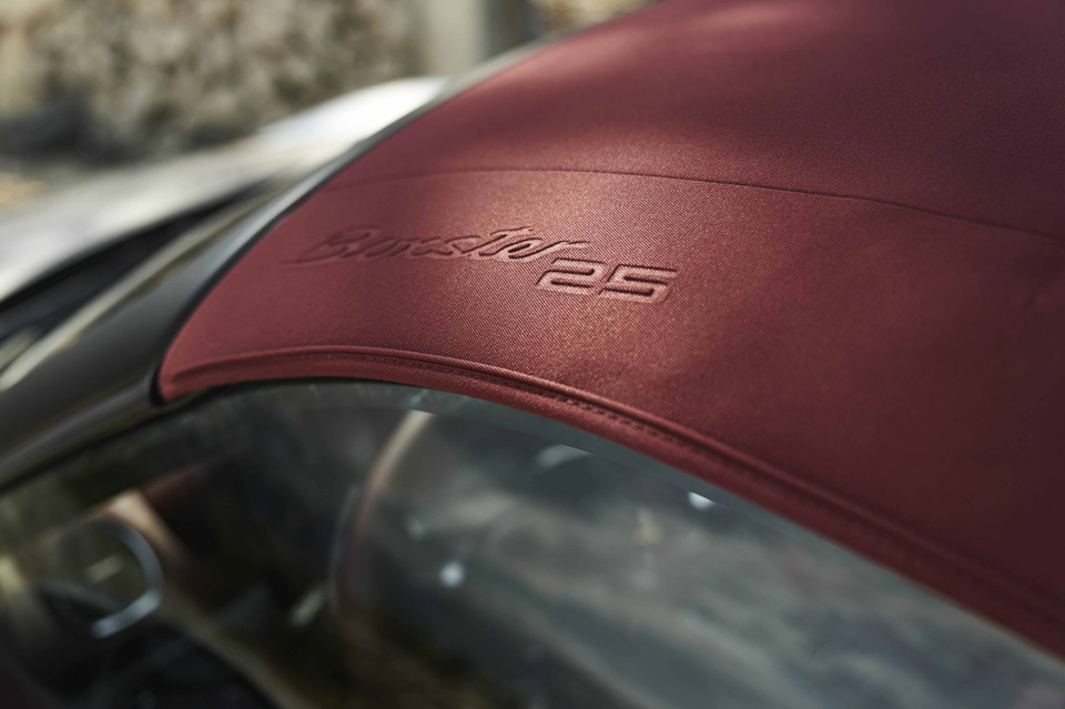 限量车型采用波尔多红真皮内饰搭配红色织物活动顶篷,活动顶篷上压印“Boxster 25”文字标识。此外新车型的标配更为丰富,包含了铝制内饰组件、14向电动调节运动型座椅、带“Boxster 25”文字标识的车门槛饰板以及可加热GT多功能运动型真皮方向盘等。