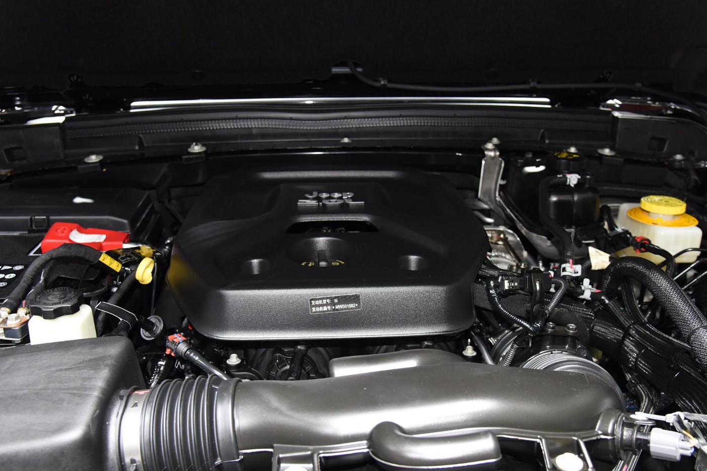 前脸依旧采用Jeep家族经典的七孔式进气格栅,并与两侧圆形大灯融为一体,下方保险杠造型依旧宽大而又突出,搭配宽体轮眉,看上去野性十足。前大灯采用的是圆形设计,这款车型配备的是LED光源,具备日行灯和自动头灯。