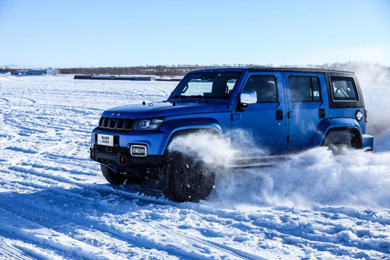 车身侧面,新车整体造型十分方正,其中前后翼子板大幅向外突出,并将大尺寸熏黑风格多辐条轮圈和全地形越野轮胎融入其中,再加上较高的离地间隙,使得整车的越野气息更加浓厚。此外,新车的侧门、车顶、前风挡玻璃等车身部位还可进行拆卸,有效提升了整车的可玩性。