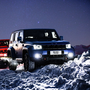 外观方面,BJ40刀锋英雄版沿用了现款BJ40的设计语言,其中汽油版车型采用红色哑光涂装,而柴油版车型采用蓝色哑光涂装。前脸方面,BJ40刀锋英雄版采用标志性的大尺寸七孔样式进气格栅,再搭配上两侧造型方正的LED前大灯组,以及同样方正的大尺寸雾灯,使得整车视觉上十分硬朗。此外,新车还在前保险杠上布置了两个红色拖车钩,进一步突出了整车的硬派越野气息。