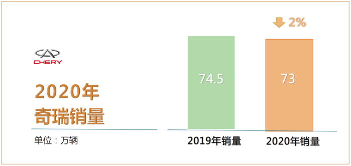 日前,奇瑞发布2020全年销量数据,其中集团累计销量73万辆,同比微降2%,其中奇瑞汽车(含奇瑞、星途、捷途和新能源)累计销量44.9万辆,同比增长8.6%,全年累计出口量为11.4万辆,同比增长18.7%,连续18年位居中国品牌乘用车出口第一。截至数据发布时,奇瑞集团全球累计销量达到905万辆,其中海外销量170万。