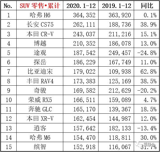 毫无悬念,去年的年度销冠又是哈弗H6,2020年累计销量364,352辆,将亚军长安CS75甩开了超过10万辆的差距。