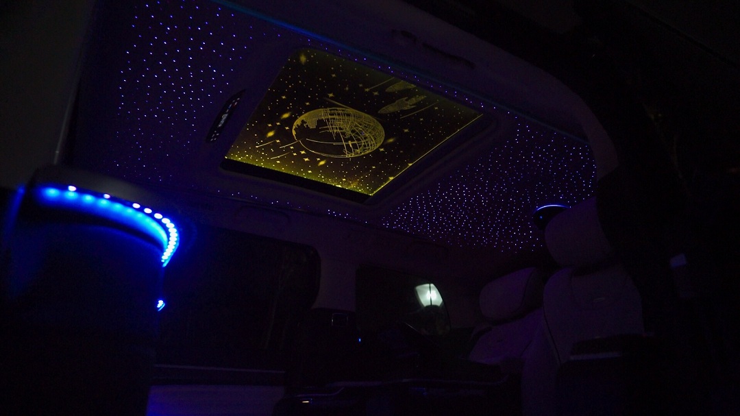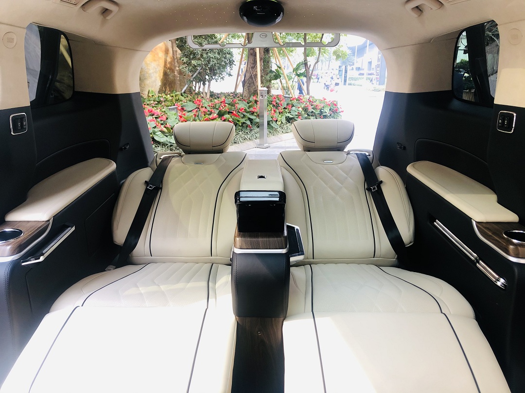 新车后排,整车为四座设计,第二排为两个单独座椅,座椅位置几乎可以调整至接近180度。同时,在第一排与第二排中间增加了一块大尺寸显示器,将车内分为两个空间,提升了后排乘客的私密性。并且,后排除了可以看电影外,还可以通过下方横向布置的屏幕来了解车辆信息等功能。此外,在车内还布置了星空顶以及中间的大尺寸天幕,使车内更加温馨。