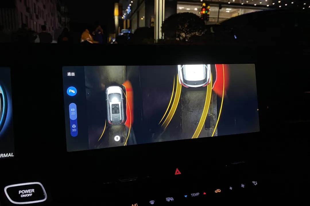 另外,全景影像在黑暗环境下的成像素质还有待加强,尤其是尾部和侧面影像,影响比较大。从图中也能看到大部分画面都是黑乎乎一片,这种情况更多需要车身上的协调设计,比如尾部倒车灯的投射角度是不是可以稍微往下一点,然后侧面后视镜是否能加一个探照灯?另外,全景影像上还集成了障碍物距离提示功能,但这一圈提示实在是太出戏了,晚上的时候基本可以把原来你想看到的障碍物覆盖掉,直接看不到障碍物,这些在UI设计上还有改进的空间。