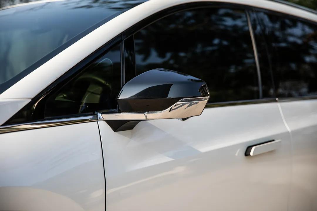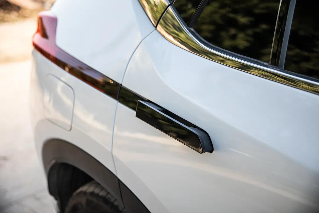 AION V的门把手都设计成隐藏式,在揣着钥匙往车走近的时候会自动解锁并且伸出门把手,如果是高配车型有电动折叠后视镜的话,两只小耳朵还会同步打开,这仪式感营造得可好了。后门把手还巧妙的和尾灯的延长造型融合在一起,这种设计小创新真可以给个高分。